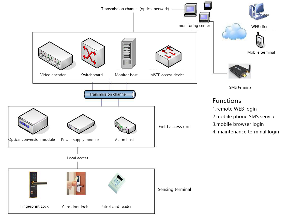 Ticom Tech provides a set of intelligent door control solutions with integration of security and anti-theft door, smart door lock, no card identification, SMS terminal management, remote control, intelligent linkage and centralized monitoring for the newly renovated machine room, the new repeater and the communication signal room. The solution is based on the technology of automatic identification and management without card, remote centralized monitoring and intelligent management, so as to realize the unattended, centralized and efficient management of the communication machine room.