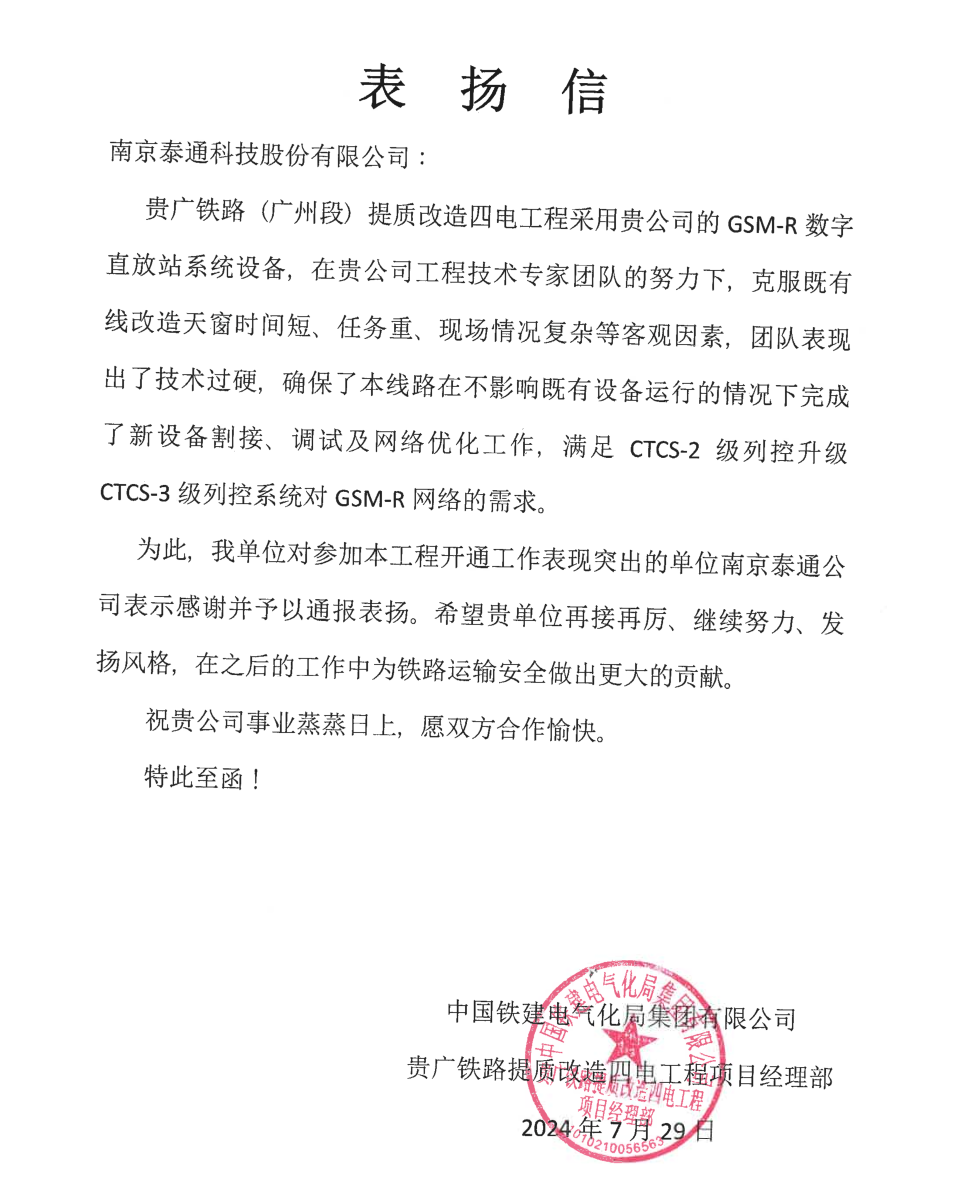近日,泰通科技收到中國鐵建電氣化局集團(tuán)有限公司發(fā)來的表揚(yáng)信。信中對公司在貴廣鐵路(廣州段)提質(zhì)改造四電工程中出色的專業(yè)能力和高效的團(tuán)隊(duì)協(xié)作表達(dá)了感謝,同時(shí)希望泰通科技再接再厲,在之后的工作中為鐵路運(yùn)輸安全做出更大貢獻(xiàn)。