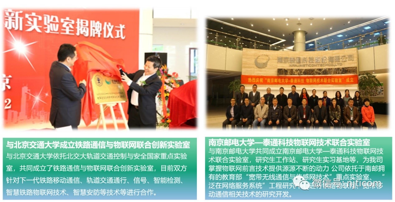 科技創(chuàng)新的成功與建立產(chǎn)學研合作平臺、引進高層次的技術(shù)團隊、重視技術(shù)人才的培養(yǎng)與激勵等密不可分。目前泰通科技與南京郵電大學、北京交通大學、東南大學、中國科學技術(shù)大學、南京航空航天大學、陸軍工程大學等多所國內(nèi)知名高校建立了聯(lián)合實驗室和合作關(guān)系,企業(yè)設立了江蘇省博士后工作站,引進了高端人才團隊和雙創(chuàng)人才。