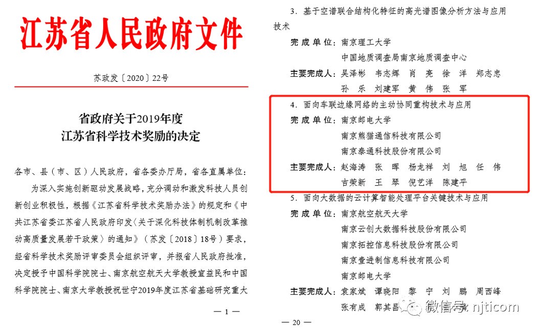 近日,江蘇省人民政府發(fā)布《關(guān)于2019年度江蘇省科學技術(shù)獎勵的決定》(蘇政發(fā)〔2020〕22號),泰通科技參與的“面向車聯(lián)邊緣網(wǎng)絡的主動協(xié)同重構(gòu)技術(shù)與應用”項目獲得江蘇省2019年度科學技術(shù)獎二等獎,董事長吉榮新、總工程師陳建平為本項目的主要完成人,這是我公司首次在軌道交通與物聯(lián)網(wǎng)領域獲得的省部級二等獎。